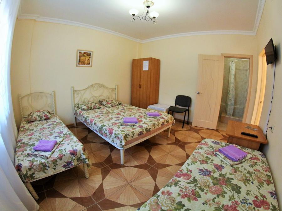 Размещение в 1-, 2-, 3-, 4-местных номерах стандарт с санузлом (в одноместном номере находится рядом с комнатой), ТВ, холодильником, сплит-системой. В двухместных номерах двуспальная кровать, в трехместных – двуспальная и односпальная, в четырехместных – двуспальная и две односпальных. 2-, 3-местные номера расположены на третьем этаже, 1-, 4-местные – на первом.