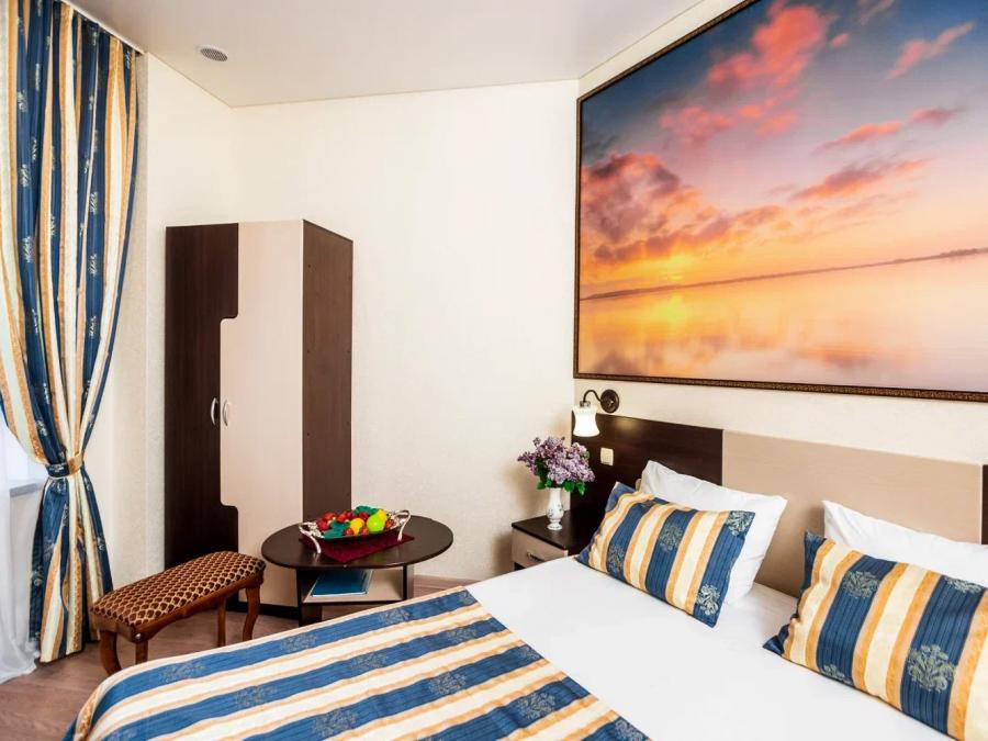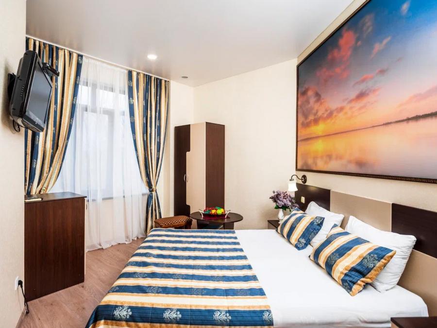 2-местный стандарт мини с двуспальной кроватью, ТВ, холодильником, санузлом, сплит-системой, чайником, посудой, Wi-Fi. Площадь номера 13 кв. м.