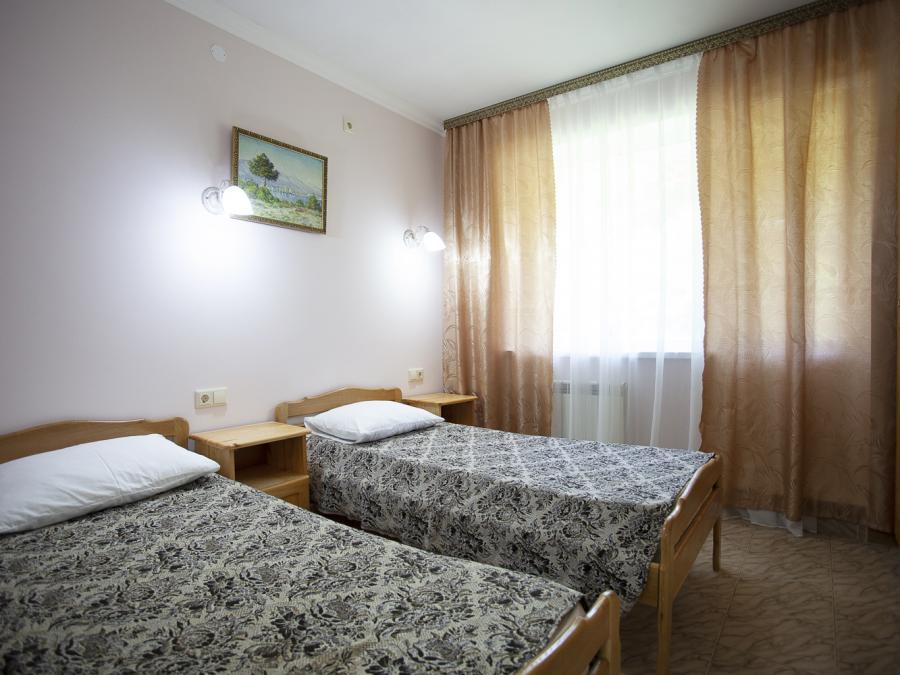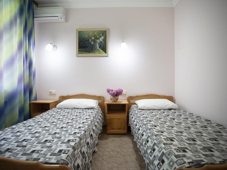 2-местные номера «Дружба». Площадь 15 кв.м., две односпальные кровати, ТВ, холодильник, балкон, сплит система, душ, туалет, Wi-Fi. Вид из окна в сторону гор, теневая сторона.